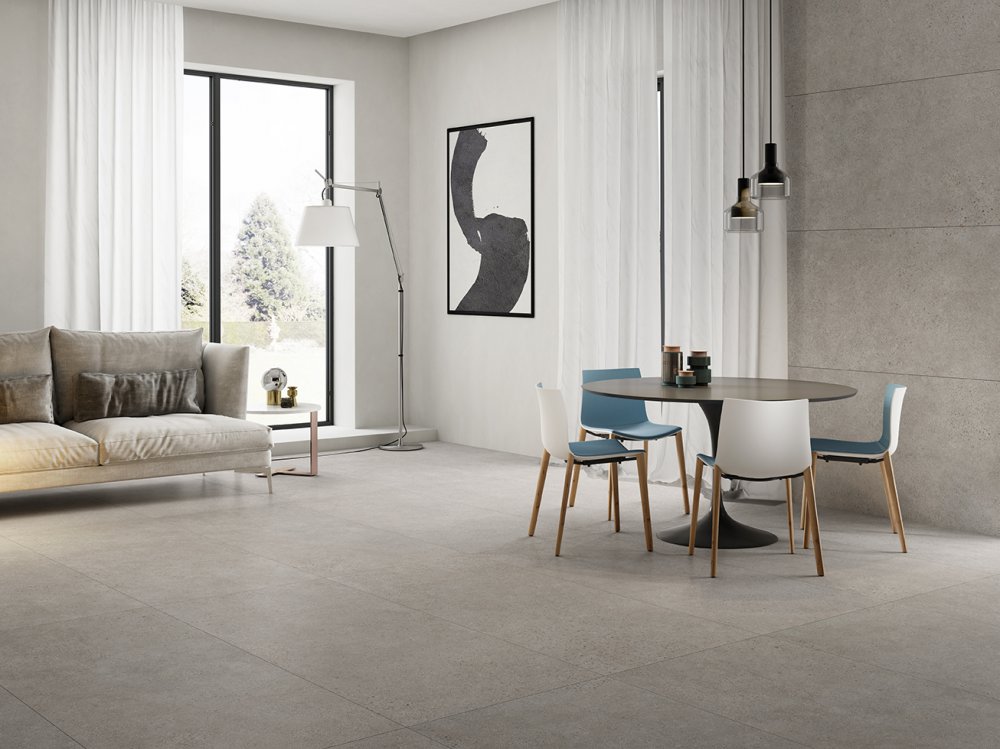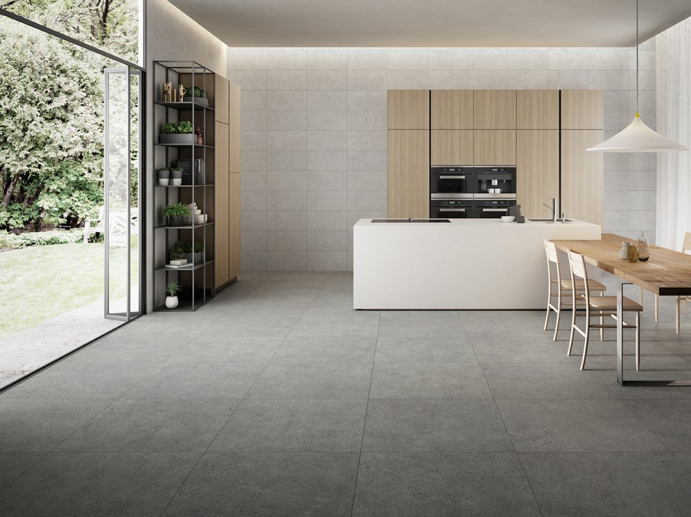 Τα ένθετα με πέτρινο αποτέλεσμα συγχωνεύονται με σκυρόδεμα σε ένα σύγχρονο υλικό πλούσιο σε evocations της φύσης