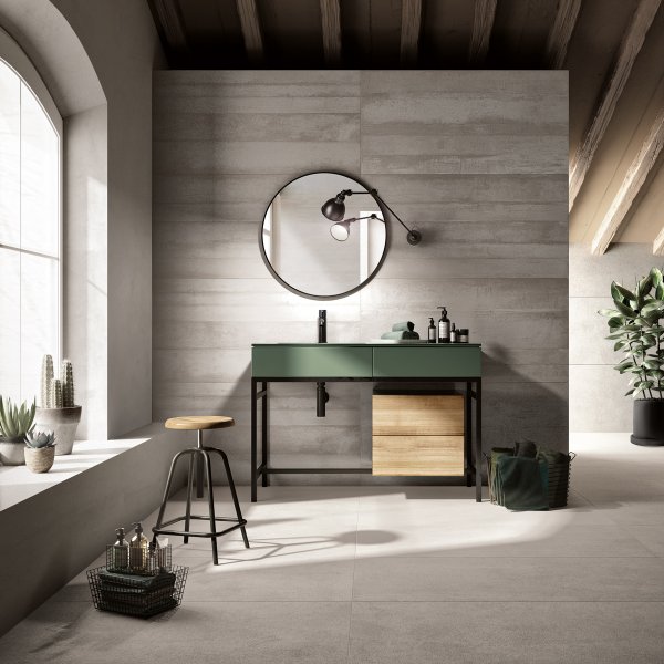 Το αποτέλεσμα ομοιογενούς σκυροδέματος με μαλακή επιφάνεια είναι αυτό που επιδιώκεται. Και, ανάλογα με τον χώρο στον οποίο τοποθετείται, παίρνει εντελώς διαφορετικές αισθητικές και αισθητηριακές χροιές. Από την κομψή μπουτίκ μέχρι τη σοφίτα με τα ψηλά ταβάνια, από το διαμέρισμα μέχρι το μοντέρνο εστιατόριο. Κατασκευασμένο από ολόσωμη χρωματιστή πορσελάνη, με τέσσερις αποχρώσεις σε χρωματική κλίμακα, από σχεδόν λευκό έως σχεδόν μαύρο, και πέντε διαστάσεις – 90×90 cm, 45×90 cm, 60×120 cm, 60×60 cm 30×60 cm – για πλήρη στυλιστική συνέχεια μεταξύ δαπέδου και επένδυσης, καθώς και δύο πρόσθετες μορφές – 60×120 cm, 30×60 cm – για λύσεις εξωτερικού χώρου.